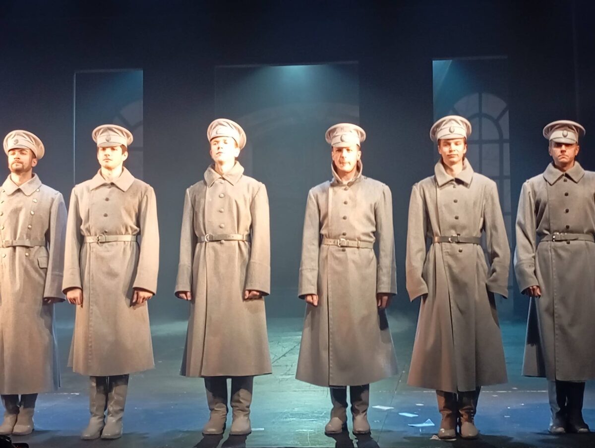 Интересно решен вопрос с костюмами. В первом акте всё серое: шинели, штаны, кители, сапоги, пальто, платки и пр. Во втором массовка, изображающая турок или русских беженцев, надевает цветную одежду, главные же герои остаются верны серому. Но смотреть спектакль это не мешает. Меня это так удивило (помните, я жаловалась на "Леопольдштадт" в РАМТе, где блеклые костюмы путают зрителей?), что я в антракте отправилась искать площадь залов в РАМТе и Ленкоме. Оказалось, они почти одинаковые. Но, во-первых, в "Беге" немного главных героев, и их мы знаем с детства. При всем желании Черноту с Голубковым перепутать невозможно. Во-вторых, в Ленкоме очень сильные актеры.