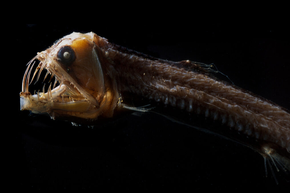 Второй монстр — длиннорогий саблезуб (Anoplogaster cornuta). Вопреки своему пугающему виду, он крошечный — всего 15 см. Но внешность у него… как у монстра из кошмаров.
