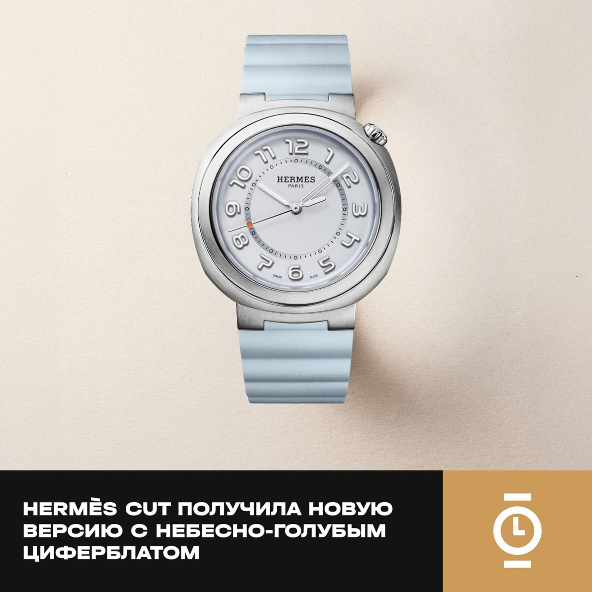 HERMÈS CUT ПОЛУЧИЛА НОВУЮ ВЕРСИЮ С НЕБЕСНО-ГОЛУБЫМ ЦИФЕРБЛАТОМ #новости_WD Hermès представила обновлённую модель Cut — теперь с циферблатом нежно-голубого оттенка. Созданная под руководством Филиппа Дельоталя, коллекция, дебютировавшая в 2024 году, сочетает спортивную элегантность и универсальный повседневный стиль. Корпус диаметром 36 мм выполнен из стали и сохраняет фирменные подушкообразные линии с двумя плоскими гранями по бокам, от которых модель и получила своё название. Заводная головка на 1:30 поддерживает визуальную симметрию, а корпус выдерживает давление до 100 метров. Версия предлагается с бриллиантовым безелем или без него. Циферблат украшен накладными арабскими цифрами с люминесцентным покрытием и фирменными оранжевыми акцентами Hermès. Внутри установлен автоматический калибр H1912 от Vaucher Manufacture Fleurier с 50-часовым запасом хода. Модель доступна на голубом резиновом ремешке или стальном браслете. Цена — от 5 400 до 10 500 евро в зависимости от версии. 🔶 П