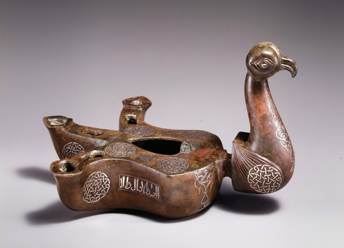 Скульптурная привлекательность этой лампы редко встречается в исламских предметах повседневного пользования. Её наиболее яркой особенностью является то, что протома (декоративное изображение передней части животного, в данном случае птицы) образует единое целое с корпусом лампы: стилизованная куропатка, хвост и крылья которой представлены носиками. На самой протоме изображен ещё один набор коротких, заострённых крыльев; чаще всего на краю или на кольцеобразной ручке, обращенной к внутренней части лампы, восседает небольшая птица целиком, а не только её голова и шея. У большинства бронзовых ламп всего один или два носика, а у этой – три. Также необычны отверстия для подвешивания на верхней поверхности корпуса лампы, которые свидетельствуют о том, что она предназначалась не только для установки на высокой ножке (ныне утраченной), но и для подвешивания. Поверхность украшена гравированными растительными завитками в медальонах, инкрустированных серебром и медью. Надписи на двух прямоуг