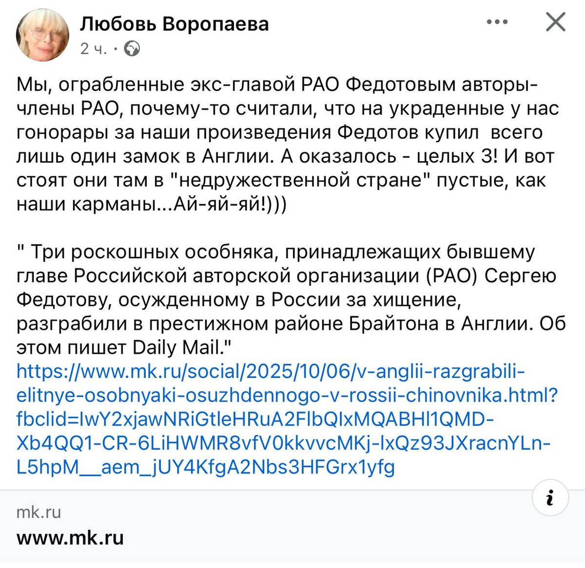 Резидентка Патриарших, автор песен Любовь Воропаева не удивилась, что у экс-главы РАО аж три замка в Англии