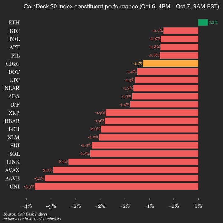 Обновление производительности CoinDesk 20: Uniswap (UNI) упал на 3,3% из-за снижения индекса