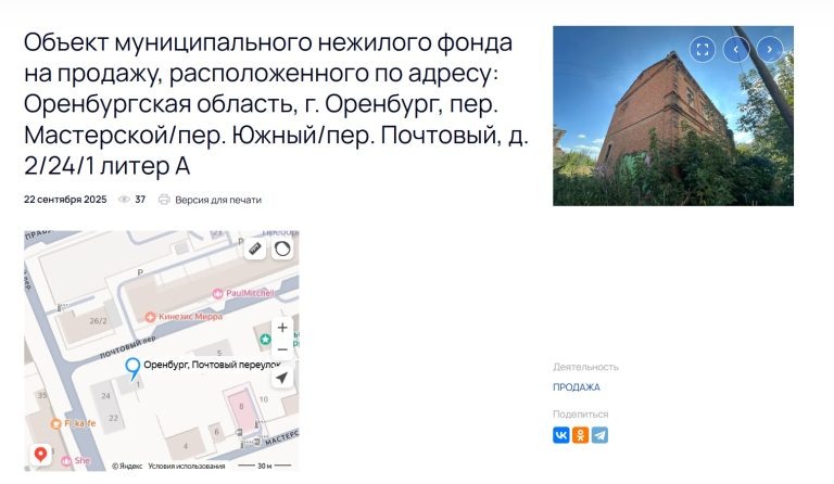 На сайте администрации Оренбурга опубликован каталог городской недвижимости для аренды и покупки. Мэрия впервые публично представила полный список городского имущества, который муниципалитет готов продать. В каталоге три раздела: аренда, продажа и аренда земли. Под аренду на сайте пока опубликовано 17 объектов недвижимости. Это нежилые помещения, первые этажи зданий и подвалы. Большинство — в центре города, но есть объекты на Чкалова, в Промышленном районе и в Степном. Стоимость аренды подвала или здания в центре — от 50 до 100 тысяч рублей при шаге аукциона в три тысячи и задатке в размере от 100 до 400 тысяч. На продажу выставлены шесть исторических особняков. Все они находятся в центре Оренбурга. Среди них есть объекты ценной застройки, и объекты культурного наследия регионального или муниципального значения. Еще по одному зданию — в Степном и Промышленном районе. Сгоревшие особняки и рядом с переулком Почтовым и старые здания центра можно забрать за рубль. Стоимость остальных объек