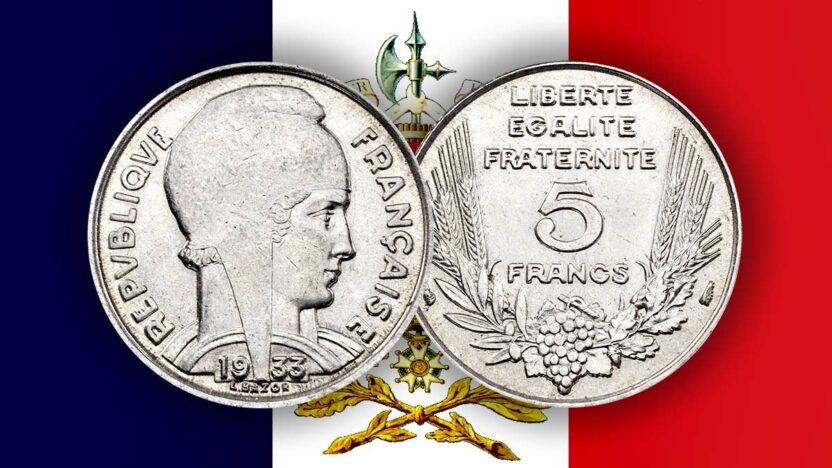 В 1933 году главный гравёр Парижского монетного двора Люсьен Жорж Базор (Lucien Georges Bazor) изготовил штемпели для новой пятифранковой монеты, которую запланировали выпустить финансовые власть Третьей Французской Республики. Особенностью монеты являлся тот факт, что, в отличие от всех предыдущих, чеканившихся из серебра, её должны были производить из никеля. Второй особенностью был её малый размер, уступавший даже двухфранковой монете, бывшей в ходу. Тем не менее, в мире бушевала Великая Депрессия, которая не прошла мимо Франции, и страна не могла себе позволить чеканку серебряных монет данного номинала. Никелевый вариант виделся вполне приемлемым, а сама монета, выпущенная в том же 1933 году, получилась симпатичной. Монетка получилась миниатюрной, как французская шансоньетка — при диаметре 23,7 мм она весила всего 6 граммов. Но темпераментным галлам она категорически не понравилась. И дело было вовсе не в дизайне, а в «несоответствии традициям и заветам отцов». Ведь прежде пять фра