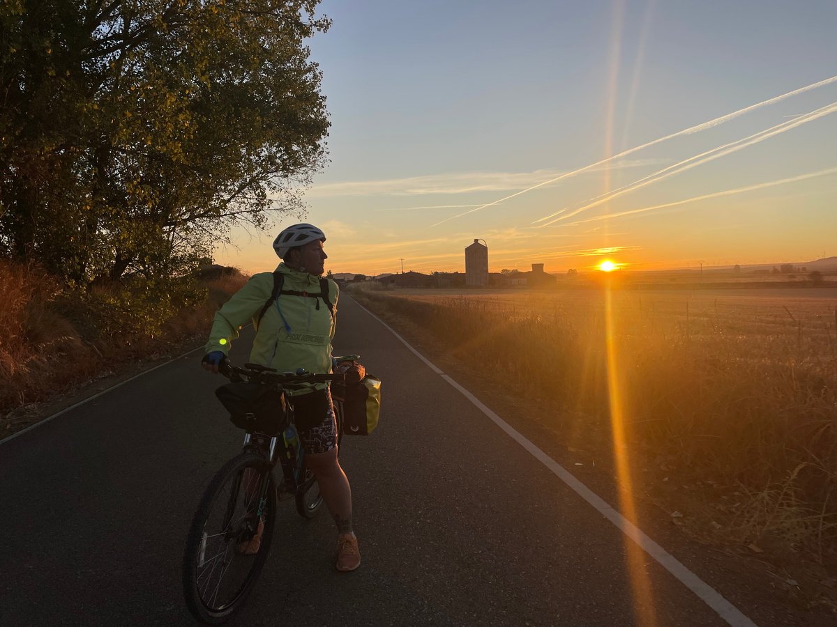 Выезжаем на красивейшем рассвете. Пролетаем Фромисту и едем в каком-то мистическом тумане. Красиво, но не очень безопасно. Видимость минимальная, в том числе, у автомобилей. Проезжаем разные небольшие города, в которых всё всегда говорит о том, что здесь проходит Путь Сантьяго. И заезжаем в Каррион-де-лос-Кондес. Очень приятный город. Задерживаемся в сувенирных лавках, пополняем запас воды и двигаемся дальше. В Саагуне решаем покушать. И спокойно катим до Берсианьоса, где сегодня ночуем. Несложный день, несмотря на пройденное расстояние. Живем в альберге Bercianos1900. Общая комната с двухъярусными кроватями, но кровати со шторками и это намного лучше, чем без них. В альберге приятный двор и кафе, где мы сидим вечером с вином, колой, чаем (нужное подчеркнуть). Вечерняя прогулка по Берсианьосу, два раза ходили в единственный магазин. И тут же в очередной раз стираем свои вещички. За день проехали: 76,5 км. Время в пути: 8:04 ч. Набор высоты: 376 м. Французский Путь Сантьяго на велосипе