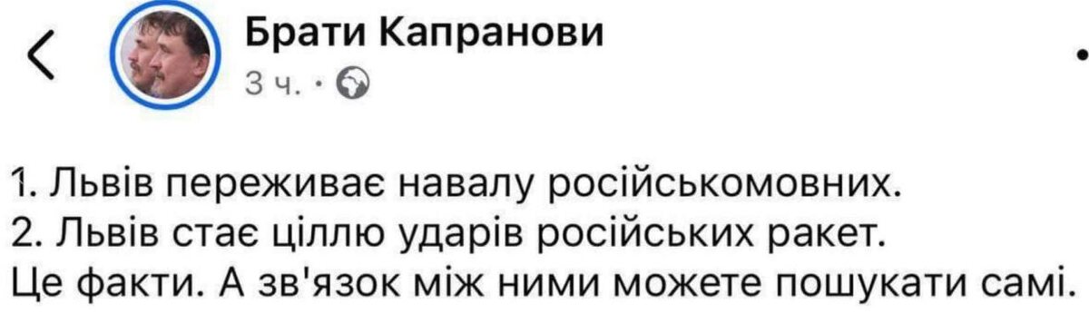 Писатель Виталий Капранов связал удары российской армии по Львову с «нашествием русскоязычных» в город