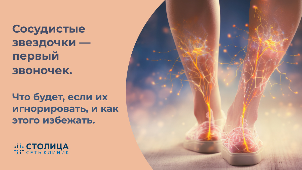 Заметили на ногах тонкую филигранную сеточку из сосудов? Многие считают это лишь косметическим дефектом, который легко скрыть под тональным кремом или колготками. Но что, если эти «звездочки» — не просто особенность внешности, а первое сообщение от ваших вен о том, что им нужна помощь? В Сети клиник «Столица» мы призываем не маскировать проблему, а понимать ее причину. В этой статье совместно с врачом сердечно-сосудистым хирургом, флебологом Сети клиник "Столица" Тополь Ириной Алексеевной разберемся, о чем на самом деле говорят сосудистые звездочки (или, по-научному, телеангиэктазии). Сами по себе сосудистые звездочки не опасны. Но они редко появляются на абсолютно здоровых ногах. В 80% случаев — это первый видимый признак слабости сосудистой стенки и начала развития хронической венозной недостаточности (ХВН). Представьте себе реку с ослабленными берегами. Сначала вода просто подмывает края, создавая мелкие ручейки (звездочки). Если берега не укрепить, течение начнет размывать их все с