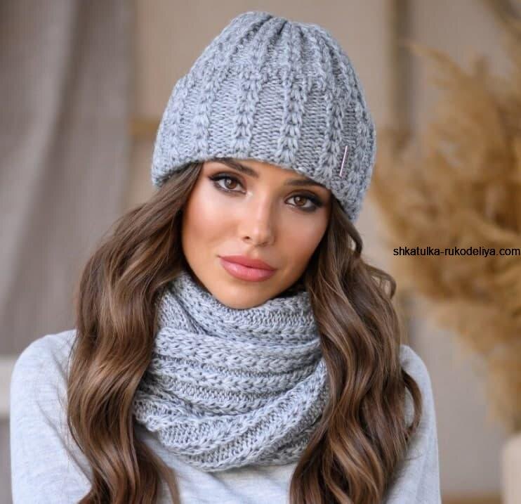 Комплект: шапка и снуд рельефным узором спицами. Схемы вязания шапок и снудов спицами Вяжем шапочку объемным узором. Описание шапочки на размер 55-58см. Потребуется пряжа 100гр на 100м примерно полтора мотка, спицы 5 мм. Вяжу этот узор плотно, т.к. рисунок хорошо растягивается в ширину, чтобы избежать деформации изделия в процессе носки обязательно вязать плотно на спицах меньшего размера. Набираю на спицы 74 петли и вяжу рисунком по схеме (но вместо 2 изнаночных вяжу 3 изнаночных петли) . 72 петли это основной узор +2 кромочные петли . вяжу отворот шапки 8-10см, затем рисунок меняю на другую сторону, для этого в одном ряду привязываю лицевые петли изнаночными, изнаночные петли лицевыми и продолжаю вязать основной рисунок до убавок . убавки начинаю делать на высоте 28-29 см от начала работы . начинаю убавлять три изнаночные петли до двух, делаю это постепенно за два лицевых ряда, затем убавки делаю в узоре. убавлять петли пока на спицах не останется примерно 14-17 петель, все убав