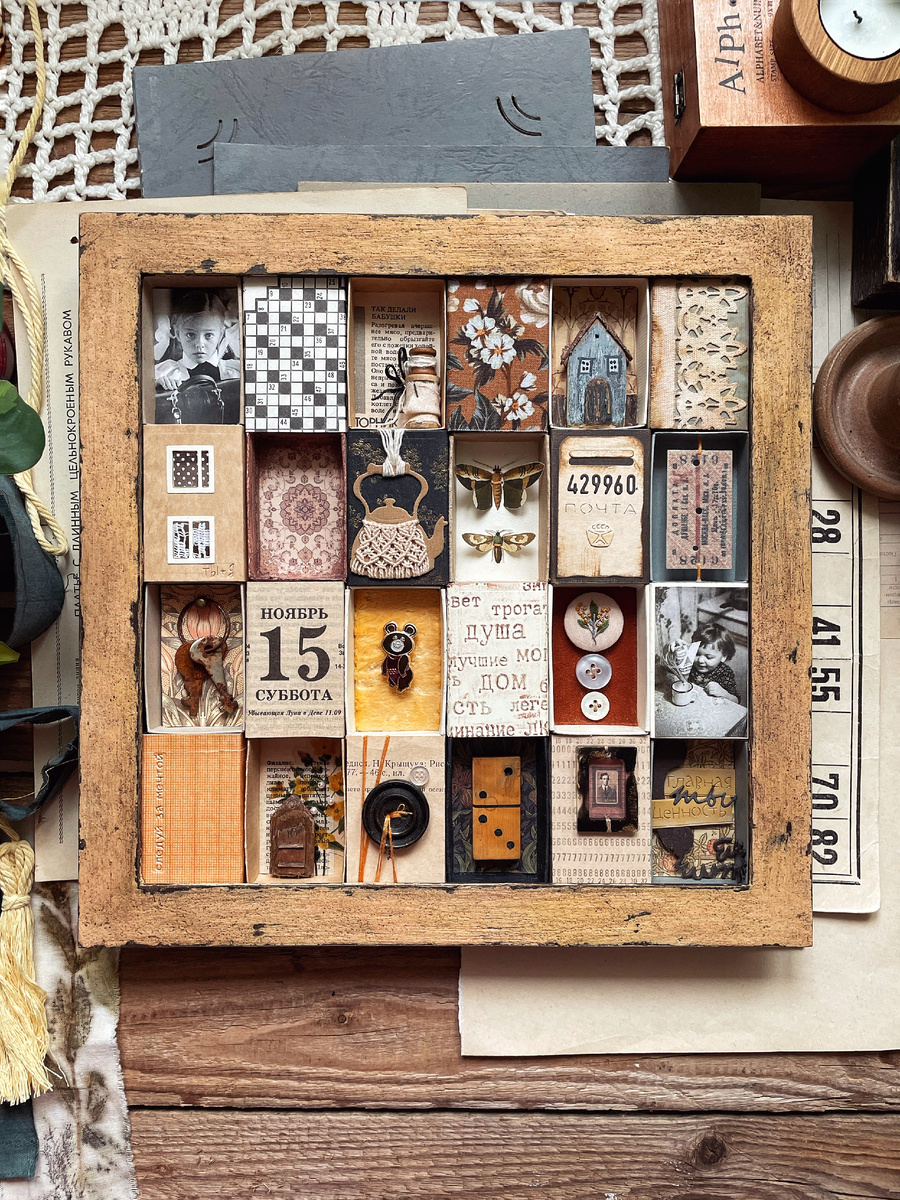 Конечно же, я не смогла устоять перед вдохновением, и в нашем проекте создала мудборд из спичечных коробков, дав ему название "Есть только миг". Поводом для его воплощения в жизнь стала дружба и ощущение счастливого детства: когда с улицы было не загнать домой, когда на первом оттаявшем кусочке асфальта сразу же рисовались "Классики", когда игра в "Казаки - разбойники" длилась весь день и ножки не уставали. И вот уже слышно из окна нарастающий по строгости голос мамы, но не хочется идти до последнего "Я сейчас сама выйду!". Ковры на стенах и полах, вышивка и ткани, красивая посуда, почтовые ящики, сталинские дома, пуговки большие и маленькие, молоко в треугольниках, обои на стенах с рисунком, кроссворды, ключики на стенах, и моль, поедающая шубки. Каждая ячейка в работе рассказывает о чем-то давно прошедшем, но таком добром, а теперь это миг.