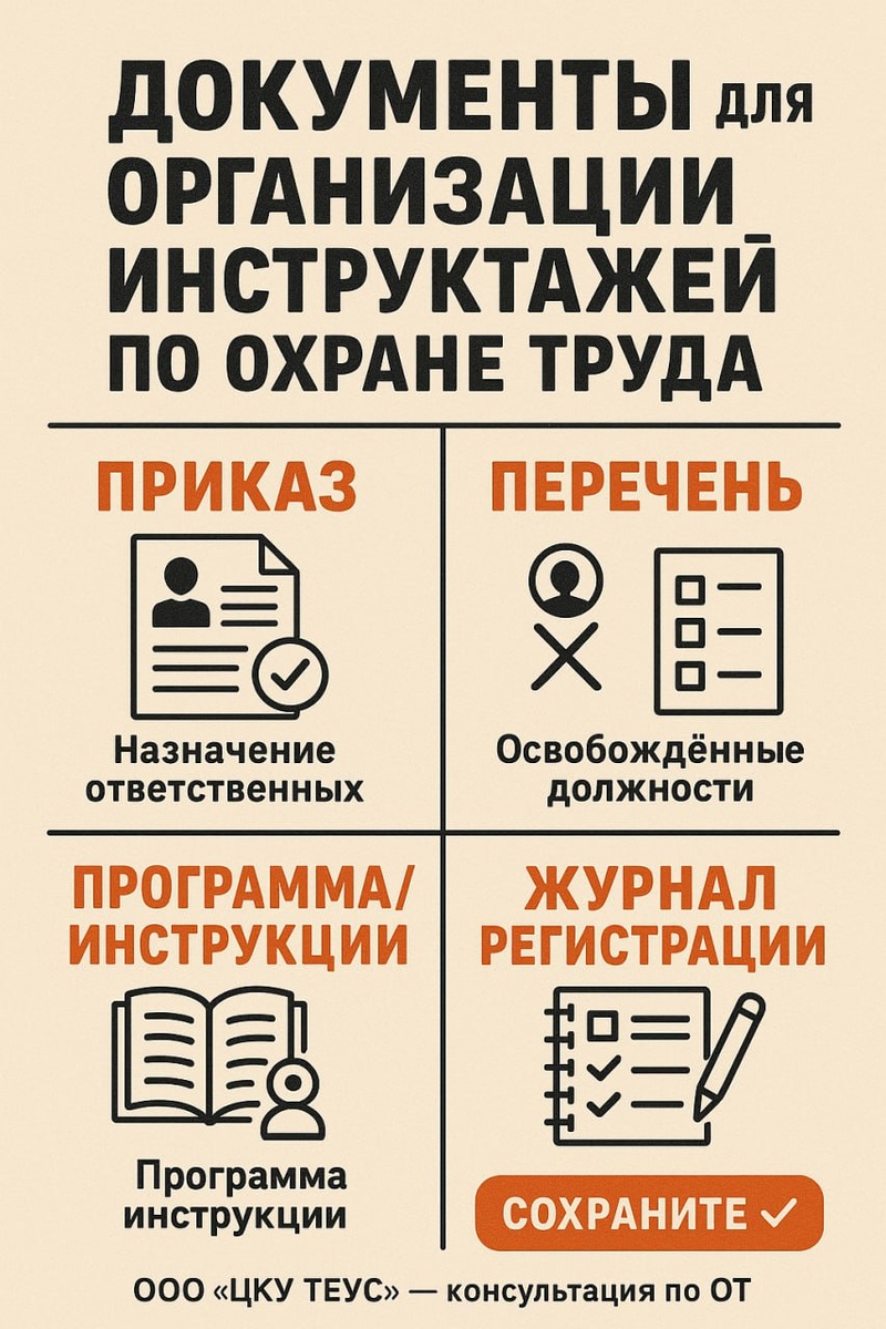 Делимся списком документов для организации инструктажей по охране труда 📚 Вам понадобятся: 🤪— приказ о назначении лиц, ответственных за проведение инструктажей по охране труда (для вводных инструктажей готовый шаблон можно скачать здесь (https://dropmefiles.com/DMviS)); 🙈 — перечень профессий и должностей работников, освобожденных от первичного инструктажа на рабочем месте (шаблон (https://dropmefiles.com/DMviS) приказа об его утверждении); 😔— программа вводного инструктажа и инструкции по охране труда (для инструктажей на рабочем месте); 😢 — форма регистрации инструктажей (журнал или другой способ) — шаблон (https://dropmefiles.com/DMviS). Сохраняйте, чтобы не потерять ✅https://dropmefiles.com/DMviS