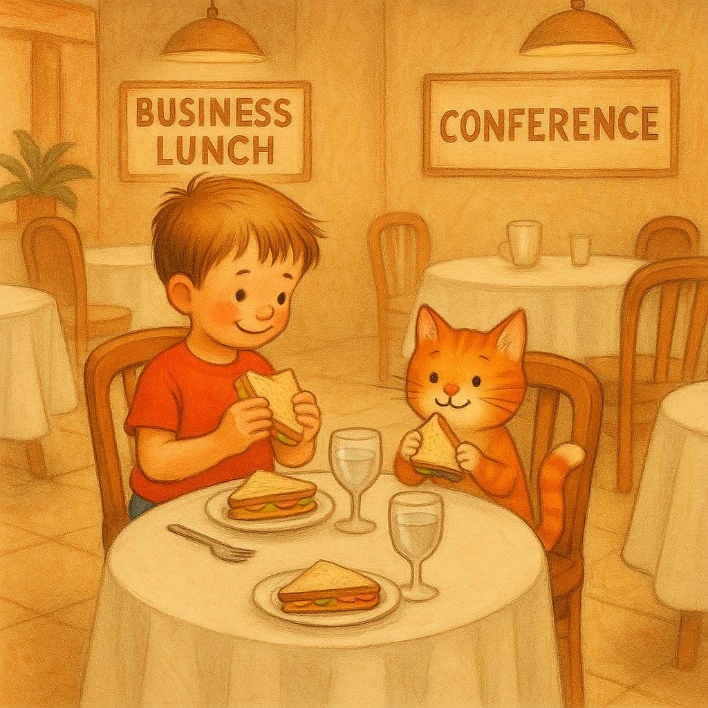История # 3 Гоша был очень любознательным мальчиком, а Палёнка не просто котиком — он был настоящим исследователем. Получив у родителей, разрешение прогуляться по территории курортного отеля, они отправились на поиски чего-нибудь новенького. Проходя мимо большого зала, они увидели, что дверь приоткрыта. - Странно, - сказали мальчик и котик одновременно и переглянулись. Это было и правда странно. Днем этот зал всегда был закрыт, его открывали только вечером, после ужина. В нем обычно показывали кино или яркие весёлые представления. Они заглянули внутрь и увидели много людей: серьезных мужчин и женщин в деловых костюмах, они оживленно разговаривали, что-то обсуждали. - Что это за праздник посреди дня? Что же тут происходит? — спросил Гоша, а Палёнка удивленно пошевелил усами. - Зайдем внутрь, надо разобраться с этими непонятками. Они ходили между разными группами, прислушивались и присматривались. Все эти серьезные люди говорили про какие-то непонятные вещи: инновации, стратегии, оп