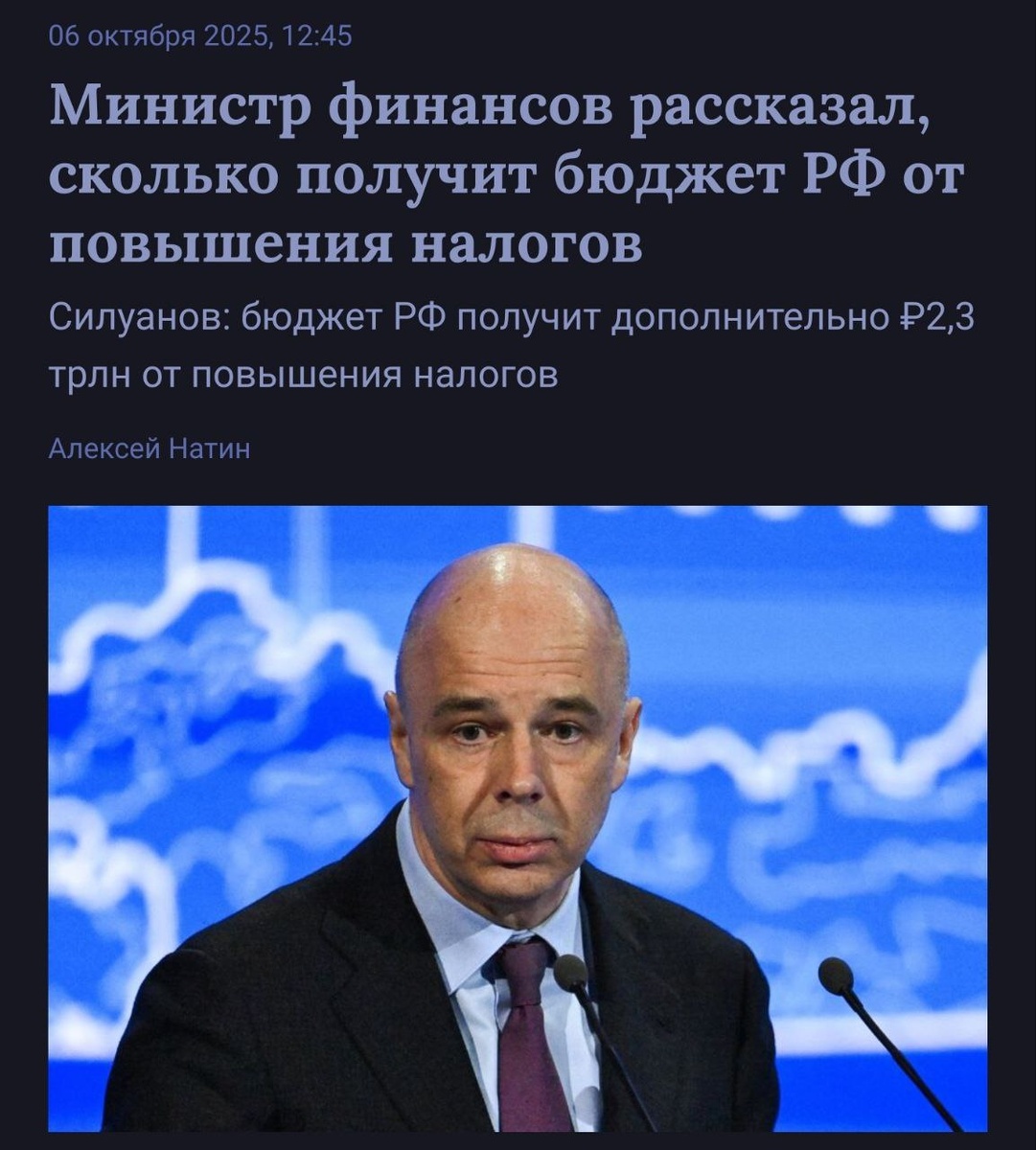 💰 Антон Силуанов похвастался, что благодаря повышению налогов сможет собрать с населения дополнительно 2,3 триллиона рублей Повышенная ставка НДС и другие растущие налоги принесут в бюджет по расчётам Силуанова дополнительно 2,3 трлн. рублей. То есть дополнительные налоги и сборы составят больше 30 тысяч рублей на каждого работающего жителя России. Интересно, если корову всё больше доить и всё меньше кормить, то вырастет ли рентабельность бизнеса или сдохнет корова? Ранее ряд российских официальных лиц и олигархов выступили за сокращение доступной медицины, ликвидацию пенсий для стариков и сокращение доступности высшего образования для детей из простых семей.