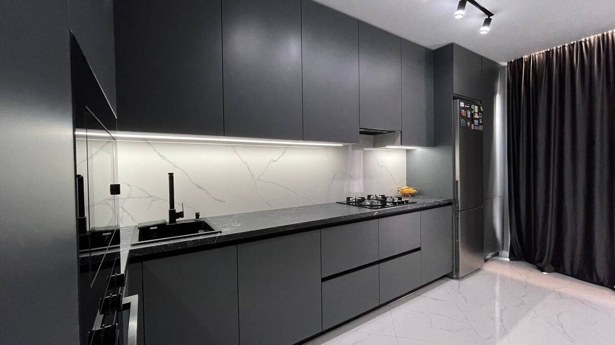 💣Серый кухонный гарнитур прочно вошел в топ стильной современной мебели, которая не выглядит скучно и сочетается как с яркими, так и нейтральными цветами. Именно такую кухню мы изготовили и установили👇 ✅Длина 2957*4818мм ✅Фасады в матовой эмали (Ral 9004) ✅Столешница Слотекс Nero Marquina 8255 ✅Стык столешниц - еврозапил ✅Пенал со стеклом и подсветкой ✅Фурнитура Blum ✅Скрытая ручка-профиль Schüco ✅Подсветка над рабочей зоной 💰Стоимость кухни в данной комплектации: 349000р 😎Серый цвет гарнитура выглядит элегантно и уместно на кухне любого стиля Хотите рассчитать стоимость такой кухни по Вашим размерам❓ 📩Присылайте проект или размеры кухни нам в сообщения