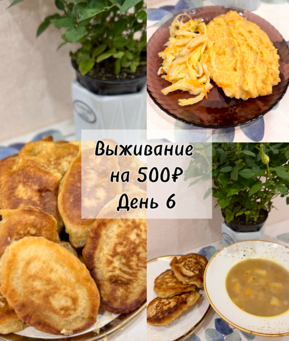 И вот у нас все ещё продолжается выживание на 500 ₽ неделю вдвоём! Да-да, уже шестой день, и я сама в лёгком шоке… завтра последний день! Семь дней - и всего 500 ₽. Даже не верится, что мы смогли дойти до этого. А ведь эта неделя ещё и без мяса - это был настоящий вызов! 😅 В общем, даже мой шок - в шоке. 🍳 Завтрак Сегодня у нас были оладьи на воде. Да-да, без молока, без кефира - просто на очень тёплой воде. И знаете что? Они получились пышными! Даже не ожидала. Для них я брала: Муки почти не осталось, (оставила чуть-чуть для последнего завтрака). Конечно со сгущёнкой или сметаной такие оладушки были бы вкуснее, но, как говорится, проект есть проект. Мы же выживаем на 500 ₽, а не устраиваем пир! 😄 Получилось 14 оладушков, но все не осилили, оставили на потом. Из напитков - как всегда, обычная вода. 🍲 Обед Тут без новшеств - гречневый суп со вчерашнего дня. Хлеба уже не будет, как и лепешек - мука на исходе, поэтому к супу пошли оставшиеся три оладушка. Да, необычное сочетание, н