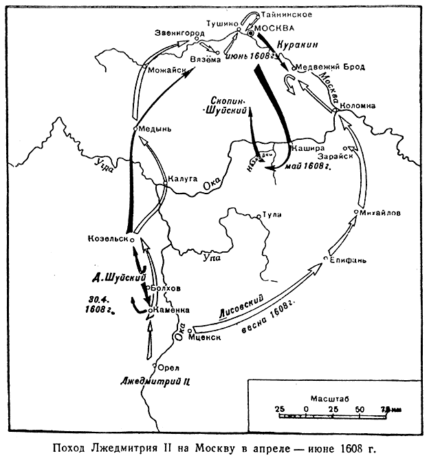 Достаточно посмотреть на карту, найти эти названия, чтобы понять, как тогда все перемешалось. Тут те, там эти, и ещё какие-то, которые то за тех, то за этих. Дело дошло до того, что власти Коломенского уезда на какое-то время отказывались принимать обе стороны, образуя третью власть, свою собственную, автономную. Отряды коломенских дворян тогда не пускали в уезд войска ни «московского», ни «тушинского» царей. Но, так продолжалось недолго. Ход событий заставил сделать выбор.