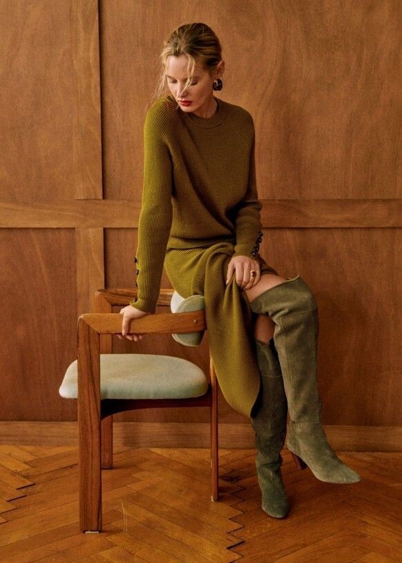 Даже сапоги — с аккуратной высотой голенища, которая визуально удлиняет ноги, а не “разрезает” их.