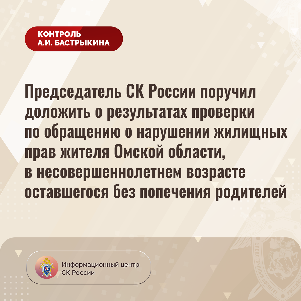 Председатель СК России поручил доложить о результатах проверки по обращению о нарушении жилищных прав жителя Омской области, в несовершеннолетнем возрасте оставшегося без попечения родителей К Председателю СК России А.И. Бастрыкину через Информационный центр обратился житель Омской области, в несовершеннолетнем возрасте оставшийся без попечения родителей, по вопросу нарушения его жилищных прав. Мужчине отказано во включении его в специализированную очередь из-за наличия в собственности жилого дома в селе Костино, находящегося в аварийном состоянии ввиду имеющихся разрушений и неисправностей инженерных систем. Несмотря на признание строения непригодным для проживания, до настоящего времени мер к предоставлению заявителю жилплощади не принято. Обращения в различные инстанции результатов не принесли. В СУ СК России по Омской области организована процессуальная проверка. Председатель Следственного комитета Российской Федерации Александр Иванович Бастрыкин поручил руководителю СУ СК России
