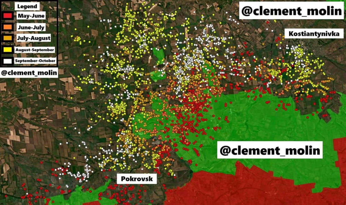 Сентябрь — это белые точки, хорошо видно, желтые — август. Если в августе чётко было видно, как российская авиация бомбит контрудар ВСУ на своё вклинение, то в сентября ситуация изменилась и есть три заметных направления.