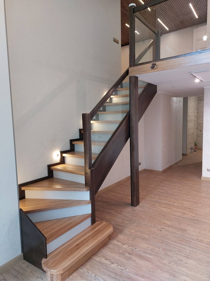 В этот раз наша работа проходила в поселке Новоселье, Ломоносовского района. Перед нами стояли две задачи: обшить металлокаркас основной лестницы деревом и спроектировать отдельную прямую лестницу в детскую комнату. Обе конструкции должны были не только выполнять свою основную функцию, но и гармонично вписаться в интерьер, подчеркнуть его современный стиль и придать пространству уют. Важно было учесть эстетику, прочность и удобство, чтобы каждая лестница выглядела цельно и органично в своем помещении. Основная лестница изначально была металлической. Наша задача заключалась в том, чтобы зашить ее премиальным цельноламельным дубом. Подступенки изготовили из МДФ и покрасили в светлый цвет эмали. Торец перекрытия также закрыли древесноволокнистой плитой, на которую с одной стороны был наклеен дубовый шпон. Особое внимание уделили ограждению: выбрали стекло, которое не только добавило легкости и визуальной воздушности, но и отлично вписалось в интерьер. Его крепление было выполнено в виде