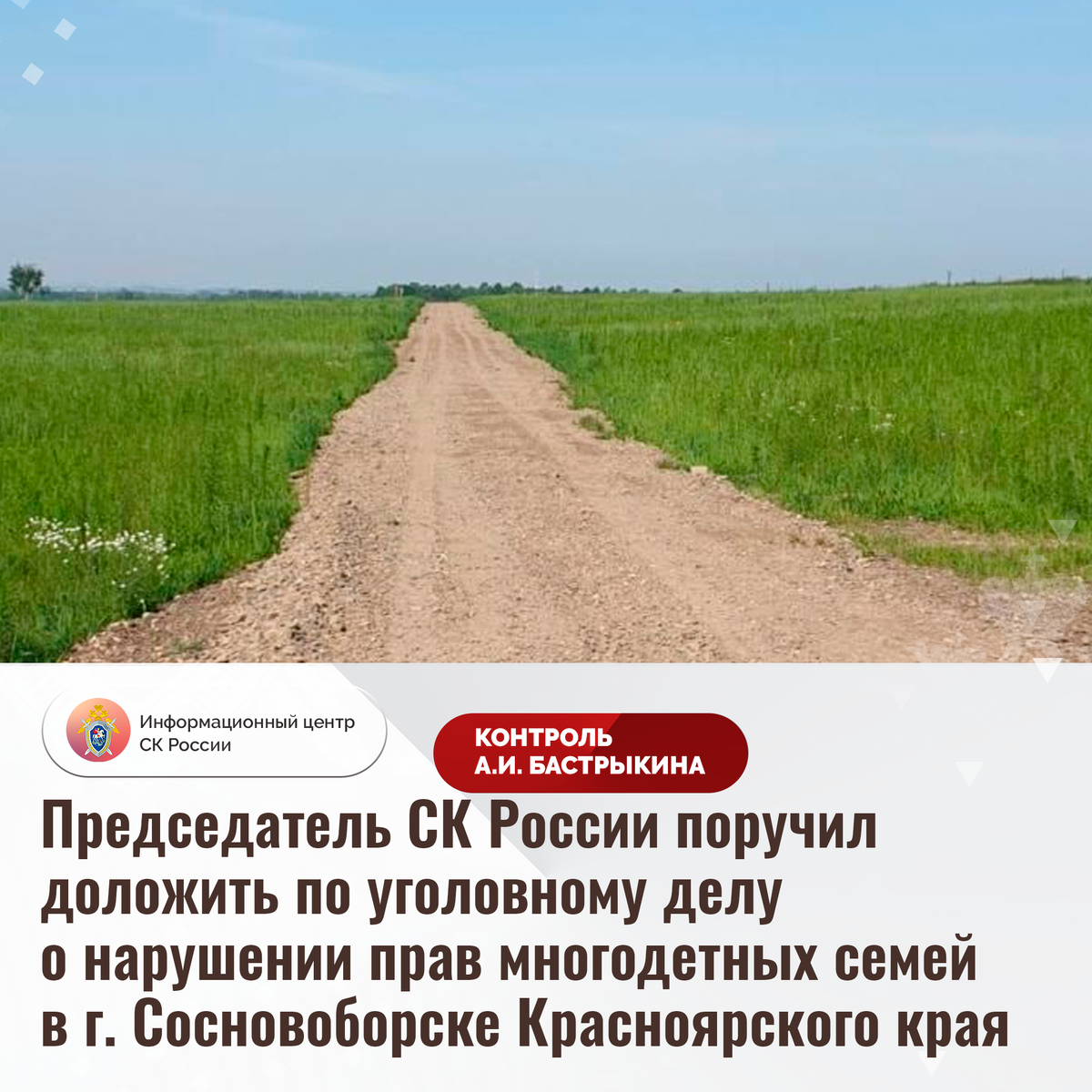 Председатель СК России поручил доложить по уголовному делу о нарушении прав многодетных семей в г. Сосновоборске Красноярского края В комментариях в аккаунте приёмной Председателя СК России А.И. Бастрыкина «ВКонтакте» поступило обращение по вопросу нарушения прав более 60 многодетных семей в городе Сосновоборске Красноярского края. В 2020 году льготной категории граждан выделены земельные участки для индивидуального жилищного строительства без надлежащей инфраструктуры: отсутствуют водоснабжение и подъездные дороги. Кроме того, их площадь не соответствует установленным нормам. Несмотря на то, что в текущем году из бюджета выделены денежные средства для благоустройства, работы в полном объеме не выполнены и приостановлены. До настоящего времени никто к ответственности не привлечен, содействие гражданам в восстановлении нарушенных прав не оказано. Указанная ситуация освещалась в СМИ. Ранее А.И. Бастрыкин ставил ее на контроль в центральном аппарате ведомства. В ГСУ СК России по Краснояр