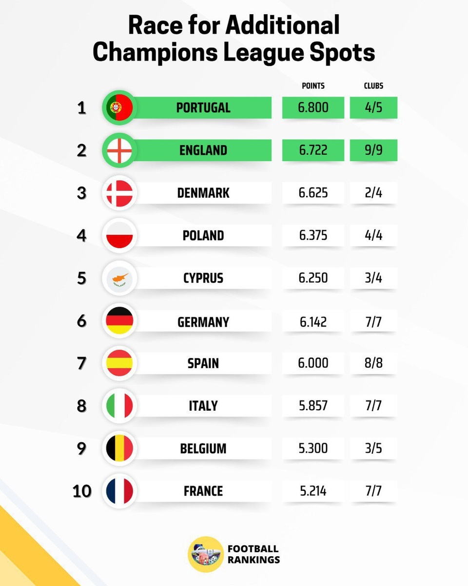 📉🇪🇺🇪🇸 LALIGA опустилась на седьмое место в таблице коэффициентов УЕФА после последнего тура еврокубков P.S. Два лучших чемпионата по итогам сезона получат лишнюю путёвку в главный клубный турнир Европы. @мировой Футбол