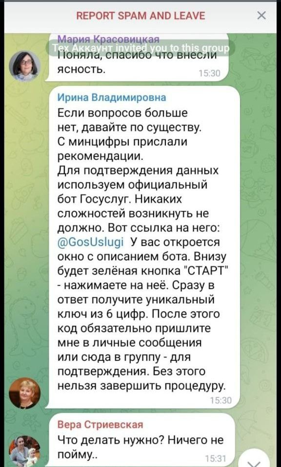 Не сообщайте никакие данные и удаляйтесь из якобы официальных чатов.