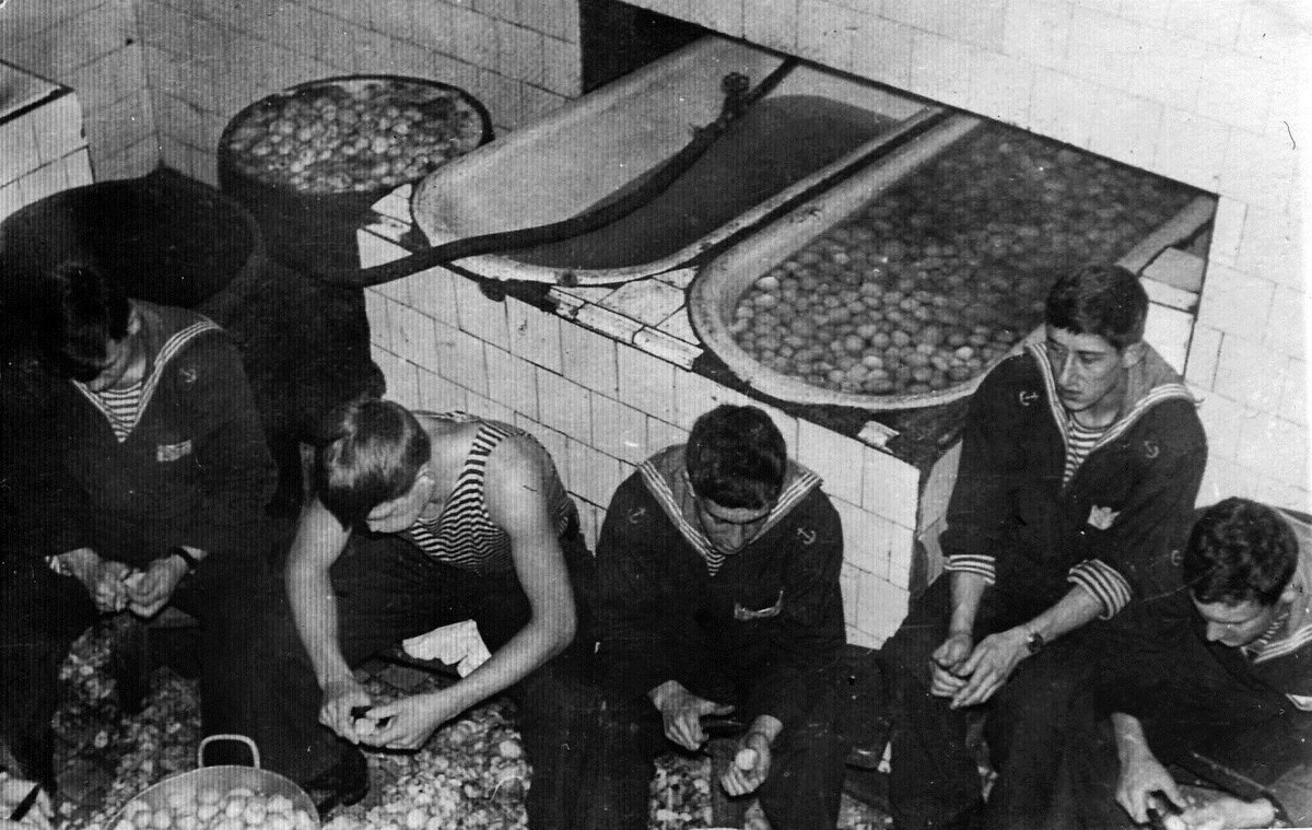 Как-то так получилось, что в процессе уборки грядок, двора от опавших листьев и вообще подготовки к снегопадам, утром, открыв холодильник, я был разочарован в отсутствии что-либо позавтракать. Проснулась и спустилась на кухню моя супруга, полная желания продолжать работы по дому, и на мой вопрос, что мы будем завтракать, задумалась. И тут по радио зазвучала песня незабвенного В. С. Высоцкого, со словами: «...Небось, картошку все мы уважаем, когда с сольцой ее намять....». Сало в холодильнике было. И супруга с доброй улыбкой, произнеся: «Вот что мы будем завтракать. Ты займись картошкой, а я пока помою окна», удалилась с ведром и тряпкой наводить чистоту. А я, произведя необходимые приготовления, сел чистить картошку. Сколько ее нужно на двоих? Ну, с десяток. И память поволокла меня по лабиринтам прошлого. Флотского прошлого. Конечно, все пробовали, и не раз, ночное пюре, приготовленного при помощи сухого пара, заправленного комбижиром, прямо из бачка. Вроде и кормили, как на убой, а