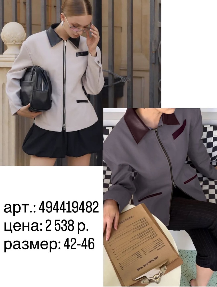Что это за вещь. Лаконичная куртка прямого кроя на молнии с чёткой линией плеча и аккуратным воротником из контрастной гладкой «кожи». Два варианта цвета: светлый беж с чёрными деталями и приглушённый серо-графитовый с винной отделкой. Карманы и планка молнии подчеркнуты узкими кожаными вставками — это создаёт чистую, почти архитектурную графику.