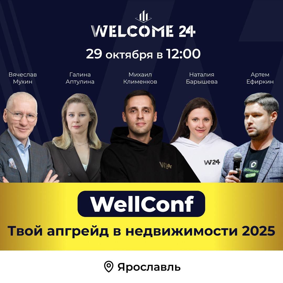 WellConf выходит в регионы! 👉🏼 29 октября — Ярославль Первая выездная конференция WellConf — это про тех, кто не останавливается, кто ищет новые инструменты, технологии и идеи, чтобы быть на шаг впереди WellConf — больше, чем конференция 🔥 Почему стоит быть на WellConf? ✅ Только эксклюзивный контент от лидеров рынка ✅ Комьюнити сильных и мыслящих агентов, где можно завести новые полезные знакомства ✅ Кофе брейк, призы от спикеров 🗣️Спикеры: — Михаил Клименков, Основатель и СЕО онлайн-агентства недвижимости WELCOME 24 — Галина Аптулина, Ментор для риелторов по соцсетям, обладатель Всероссийской премии «Достояние страны» в номинации «Лучший бизнес-тренер по соцсетям для риелторов» — Вячеслав Мухин, Гранд-мастер скоростных продаж недвижимости, руководитель департамента скоростных продаж WELCOME 24 — Наталия Барышева, Руководитель направления по новостройкам WELCOME 24 — Артем Ефиркин, Терр. менеджер развития партнерских отношений ПАО Сбербанк Просто регистрируйтесь: https://w24.