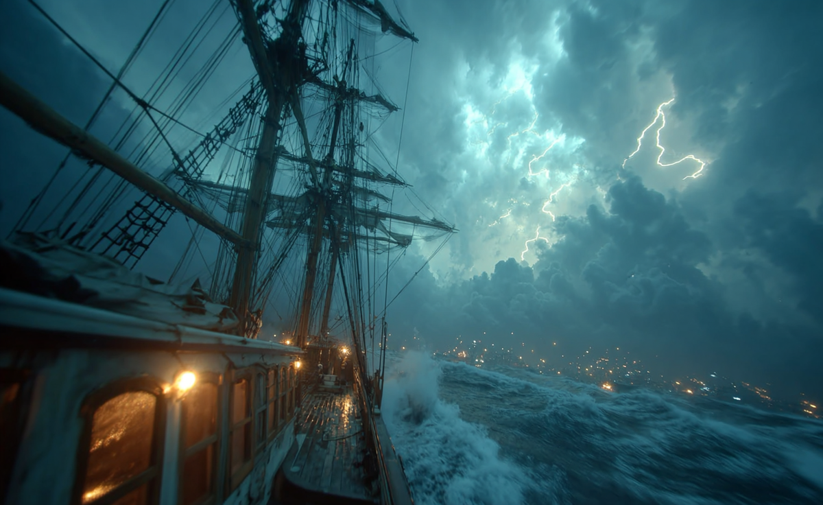 Корабль «Сирена», Атлантический океан, 1762 год. Мир свелся к хаосу. Деревянный корпус «Сирены» стонал, скрипел и трещал, словно кости великана, сжимаемые в кулаке невидимой силы. Небо, некогда усыпанное звездами, теперь было чернильной трясиной, разрываемой молниями. Холодный ливень хлестал по лицам, смешиваясь с соленой пеной волной. Молодой Чарльз, секретарь капитана, вывалился из относительной тишины своей каюты прямо в ад. Его вытолкнул нарушу не столько грохот грома, сколько отчаянные крики матросов. Палуба была полна бешено снующих теней. Они карабкались по вантам, обрезая порванные паруса, с безумной силой крутили штурвалы, их голоса, полные животного ужаса, тонули в реве шторма. — Держись! Черт бы побрал эту волну! — кто-то прохрипел мимо, прежде чем его отшвырнуло к скамейкам. Чарльз, цепляясь за все, что можно, поднял голову и увидел это. Впереди, в кромешной тьме, вздымалась стена воды. Она была так высока, что казалась не волной, а краем мира, обрушивающимся на их утл