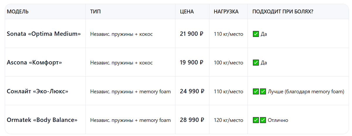 Sonata — один из самых известных и массовых брендов матрасов в России, особенно популярный в сегменте бюджет–средний класс. Давай разберём его объективно, с учётом твоих параметров: 💡 Sonata — не премиум, но надёжный масс-маркет с хорошим контролем качества для своей цены. ⚠️ Избегай, если важен комфорт и здоровье спины. ✅ Это то, что тебе нужно! 💡 Sonata — хороший выбор в сегменте 20–25 тыс. ₽, если брать модель с независимыми пружинами. Официальный сайт Sonata sonata-matras.ru ✅ Совет: На официальном сайте часто действуют акции («-15% на первую покупку», «подушка в подарок»). ✅ Да, если: ❌ Нет, если: