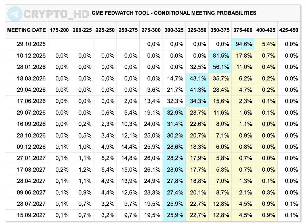 💥 FedWatch: Вероятность снижения ставки ФРС на 25 б.п. в октябре = 94,6%. Шанс на снижение ставки ФРС в декабре пока составляет 81,5% (на 25 б.п.) 📌 Напоминание, события на этой неделе: ▪Протокол с прошлого заседания ФРС. ▪Банковская конференция ФРС. ▪Конференция с Джеромом Пауэллом. P.S. Приостановка работы правительства США (шатдаун) не влияет на ФРС (❗️), т.к. ЦБ не зависит от гос. бюджета и продолжает функционировать. Протокол с прошлого заседания и конференция с Джеромом Пауэллом состоятся по плану. Ранее: нет макроданных Crypto Headlines