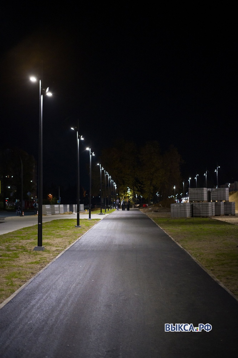 Уже смонтировано освещение, уложено асфальтное покрытие для велодорожки и идет укладка брусчатки.