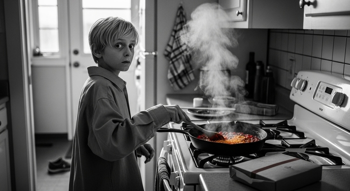 Я рванул на кухню и чуть не упал. Частично потому, что был в одном ботинке, но ещё и потому, что… там щуплый мальчишка жарил макароны Kraft Dinner.