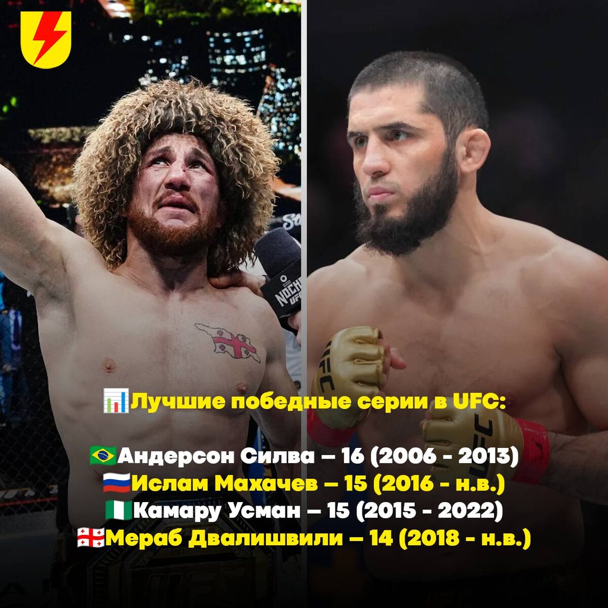 Возможно, прямо сейчас мы наблюдаем “золотую эпоху” UFC 📊В казавшимся когда-то непостижимым списке “самых длинных победных серий в истории UFC” прямо сейчас трое активных бойцов, и двое из них свою серию еще не растеряли: 🇧🇷Андерсон Силва – 16 (2006 - 2013) 🇷🇺Ислам Махачев – 15 (2016 - н.в.) 🇳🇬Камару Усман – 15 (2015 - 2022) 🇬🇪Мераб Двалишвили – 14 (2018 - н.в.) ❓Смогут ли Ислам или Мераб добраться до 20 побед подряд?