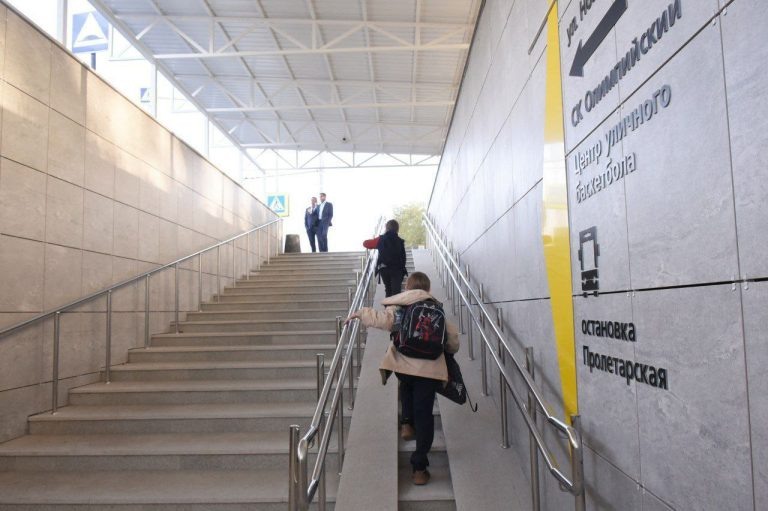Над лестницами появились навесы из профлиста. Они защитят ступени от осадков и обледенения. В переходе установили навигацию, указатели для слабовидящих и таблички со справочной информацией. Для маломобильных граждан предусмотрены пандус и перила.