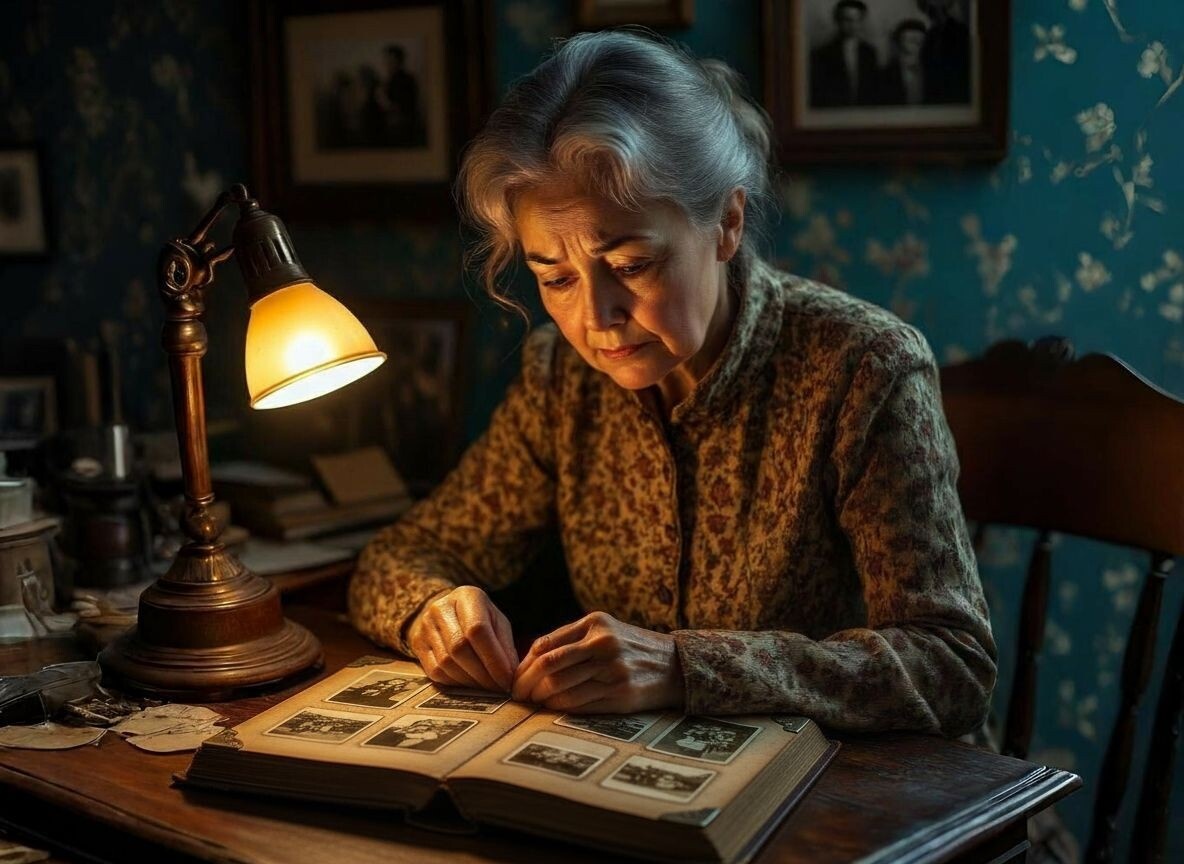 В тусклом свете настольной лампы Светлана Ивановна склонилась над старым альбомом. Её пальцы бережно переворачивали пожелтевшие страницы, а в глазах застыли слёзы. Альбом был огромным – словно книга жизни, каждая страница которой хранила свои тайны и воспоминания. Черно-белые фотографии соседствовали с более поздними цветными снимками, и каждая из них рассказывала свою историю.