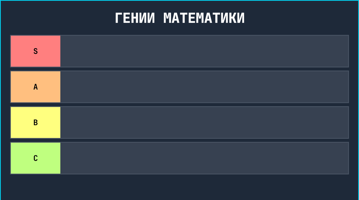 Тир-лист математиков - это не попытка определить, кто из них лучше. Даже те, кто окажется внизу списка, для меня абслютные гении. Цель поста — познакомить вас с разными математиками, напомнить о тех, о ком вы могли не знать, и просто расширить представление о мире математики.
