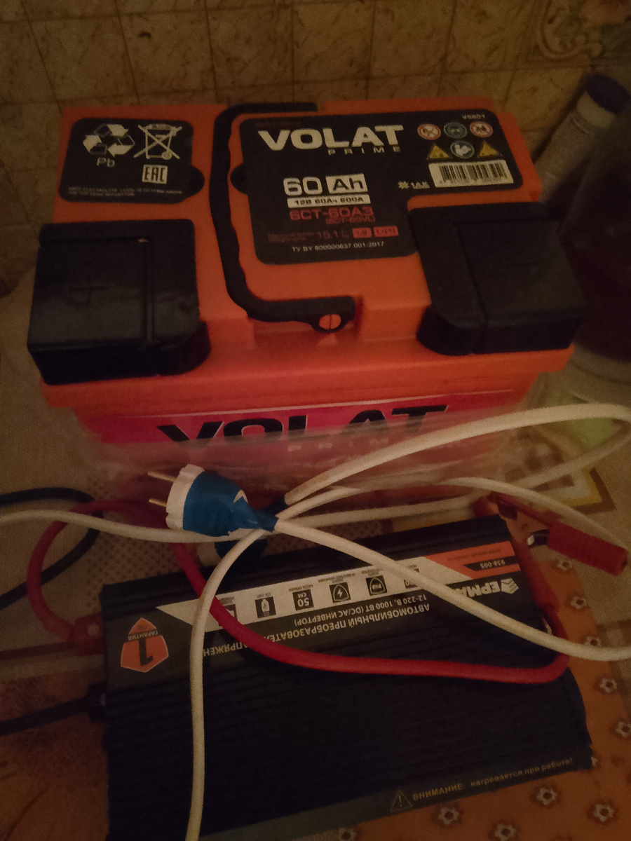 акумулятор 12 вольт и ёмкостью 60а/ч.преобразователь напряжения 12-220вольт и переходник вилка-вилка.вот так свет пропал,подключил акумулятор с преобразователем и все,есть свет как минимум ещё на 4часа.а если один телевизор питать и роутер то и на 20 часов хватит.всем советую,особенно кто в городе живёт.генератор шумит,и топливо заканчивается.да и ночью то не включишь,время вечернее,народ уже отдыхает.а так акумулятор и инвертор,есть выход из ситуации без света.генератор можно днём погонять,а акумулятор с преобразователем вечером.главное не забывать,выключить на электросчетсчике,автоматы.иначе когда снова появится ток в основной сети,сгорит инвертор,сгорит проводка.выходом из данной ситуации стало бы подключения устройства-авр,автоматический ввод резерва.