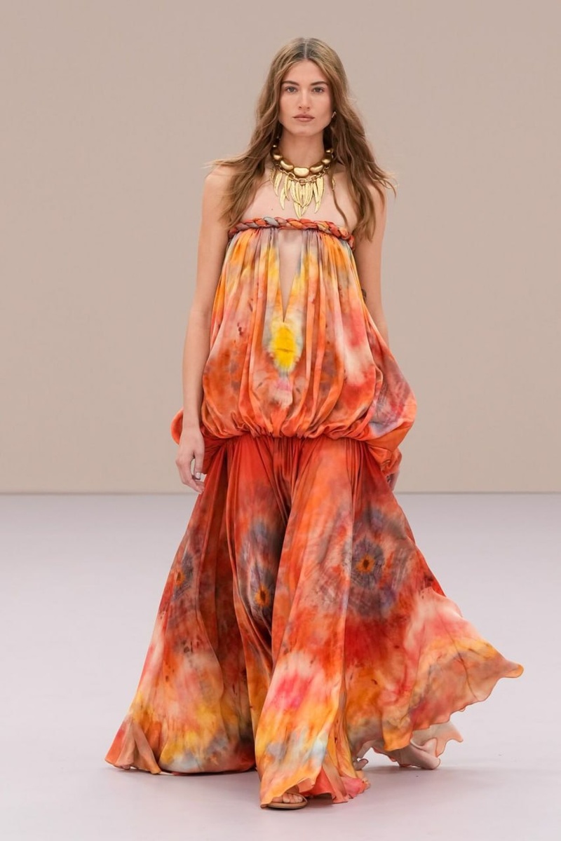 Как романтика 70-х стала носибельной сегодня (и почему это хочется сохранить) Мираж солнечной ностальгии: кринолины на паузе, тай-дай-закаты, кожа поверх тюля. Zimmermann учит воздушность жить в городе. 60 секунд сути Почему это не просто «ещё одна Zimmermann» Zimmermann не продаёт «пляж», она раскладывает ностальгию на детали кроя: тюль не для объёма, а для ритма; тай-дай — не фестиваль, а градиент света; кожа — не рок, а контур для прозрачности. В итоге воздушность не «сладкая», а взрослая. Носибельные формулы (в реальную жизнь) 1. Сарафан-сафари в горчичном + плетёные сандалии + мягкий мешочек с шахматным принтом.