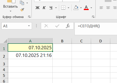- Как использовать: Просто введите в любую ячейку =СЕГОДНЯ() и нажмите Enter.