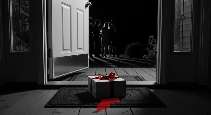 Входная дверь уже была открыта, и, как и говорили, на пороге стояла коробка с тортом из пекарни. Я медленно подошла. Как только я тронула ленту, под коробкой начала расползаться красная лужа.