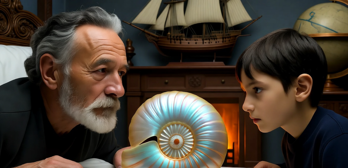 Старый капитан Лев, дед Алекса, с каждым днем угасал. Его некогда громкий голос, способный перекричать любой шторм, превратился в едва слышный шепот, а в глазах, всегда смотревших куда-то за горизонт, теперь читалась тихая усталость. Он целыми днями сидел в своем кресле-качалке у камина, укутанный в потертый плед, и смотрел на огромную раковину наутилуса, стоявшую на полке — молчаливый свидетель его былых странствий. Алекс чувствовал приближение чего-то неотвратимого, и это сжимало ему сердце холодным предчувствием. Он старался проводить с дедом каждую свободную минуту, слушая его неспешные рассказы, но в душе все еще был полон тех видений, что посетили его во время шторма. Однажды вечером, когда за окном разыгрывался осенний шторм, капитан Лев подозвал внука жестом, внезапно ставшим удивительно твердым. «Алекс, пора тебе узнать одну историю, — начал он, и его голос обрел прежнюю, командную властность. — Ту, что передается в нашей семье от отца к сыну, но рассказывается лишь однажды —