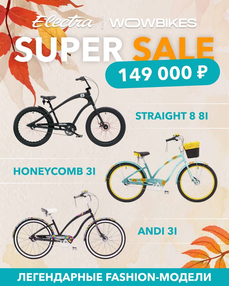 ⚡️ SUPER SALE: финальный шанс на лимитированные Electra ⚡️ С 5 сентября по 12 октября — уникальная возможность стать владельцем настоящей легенды. Мы собрали самые культовые велосипеды Electra: яркие, стильные и по-настоящему редкие. Каждая модель из лимитированной серии Fashion & Attitude Series выпущена тиражом всего 300 штук во всём мире. 🎱 Electra Straight 8 8i — культовый круизер, вдохновлённый американскими мотоциклами 80-х. Матово-чёрная рама, красные спицы и дерзкий хот-род дизайн создают образ силы и свободы. 🌻 Electra Honeycomb 3i — велосипед, в котором воплощено лето. Подсолнухи в духе Ван Гога, яркие жёлтые диски и пчелиные узоры превращают его в символ радости и тепла. 🎨 Electra Andi 3i — арт-объект на колёсах, вдохновлённый поп-артом Энди Уорхола. Насыщенные цвета, графика и детали делают его выбором тех, кто мыслит нестандартно. 👉 Дополнить образ помогут оригинальные аксессуары со скидкой до 48%: звонки, корзины, фары, сиденья и многое другое — всё для того, что