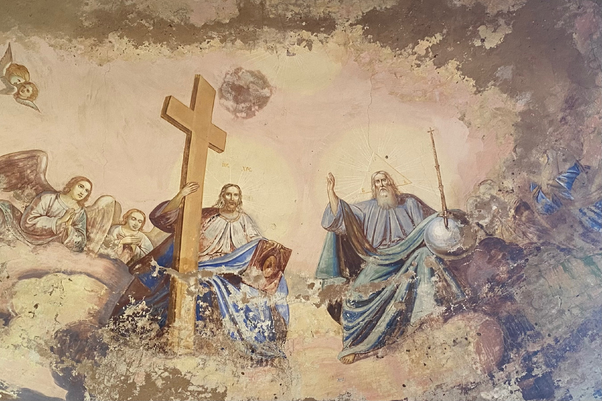 Настенные росписи Воскресенской церкви в с. Башарово К 2025 году остатки стен сохранили только одно изображение. Удивляющая четкостью прорисовки и ощущением новизны роспись купола алтаря совершенно не вписывается в общий фон разрухи. Стены трапезной почти утрачены, потолка нет вовсе, вместо пола земля, из которой, пробиваясь через обвалившиеся кирпичи, растут деревья и кусты. Продвигаясь сквозь них, как через лесную чащу, попадаешь в сам храм, сохранившийся чуть лучше, но также утративший изображения, некогда украшавшие его стены. Через несколько шагов арка алтарной стены перестает заслонять свод купола апсиды и взгляду открывается образ Троицы. На контрасте с общим запустением изображение кажется мистическим. Запретные фрески Троица написана по типу «Сопрестолие». Как и любое изображение Троицы (за исключением Ветхозаветной Троицы Рублева), роспись не считается канонической и официальной запрещена церковью, как и любое изображение Бога Отца. Однако этот факт, запротоколированный реше