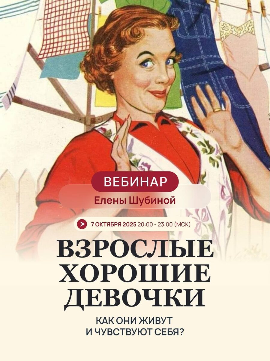ВЗРОСЛЫЕ ХОРОШИЕ ДЕВОЧКИ Как они живут и чувствуют себя? Вебинар Елены Шубиной Что случается с хорошими девочками, курносыми отличницами с туго заплетёнными косами и всегда отглаженной блузкой с годами? В кого они вырастают? В женщин, которые всегда сдают экзамены: мужу, маме, начальству, себе. В ту, что дольше всех задерживается на работе. В самую лучшую подругу для всех, которую, тем не менее, некому встретить в аэропорту. Они становятся экспертами по чужим победам и вечными должницами перед собственными мечтами. В тех, кто привык говорить «всё хорошо», когда внутренний мир покрывается трещинами. В помощь хорошим девочкам 35+ — этот вебинар. Для тех, кому уже пора выбрать себя и переосмыслить приоритеты. 📆 7 октября 20:00-23:00 (Мск) 📚 живой вебинар + его запись + бессрочный доступ + чат-поддержка в Телеграм 💳 Стоимость вебинара: 2500 руб / 30 евро ☎️ Регистрация: +7 931 231 1000 (только Telegram) Вопросы вебинара: 👼 Что такое «комплекс хорошей девочки»? Эволюция пон