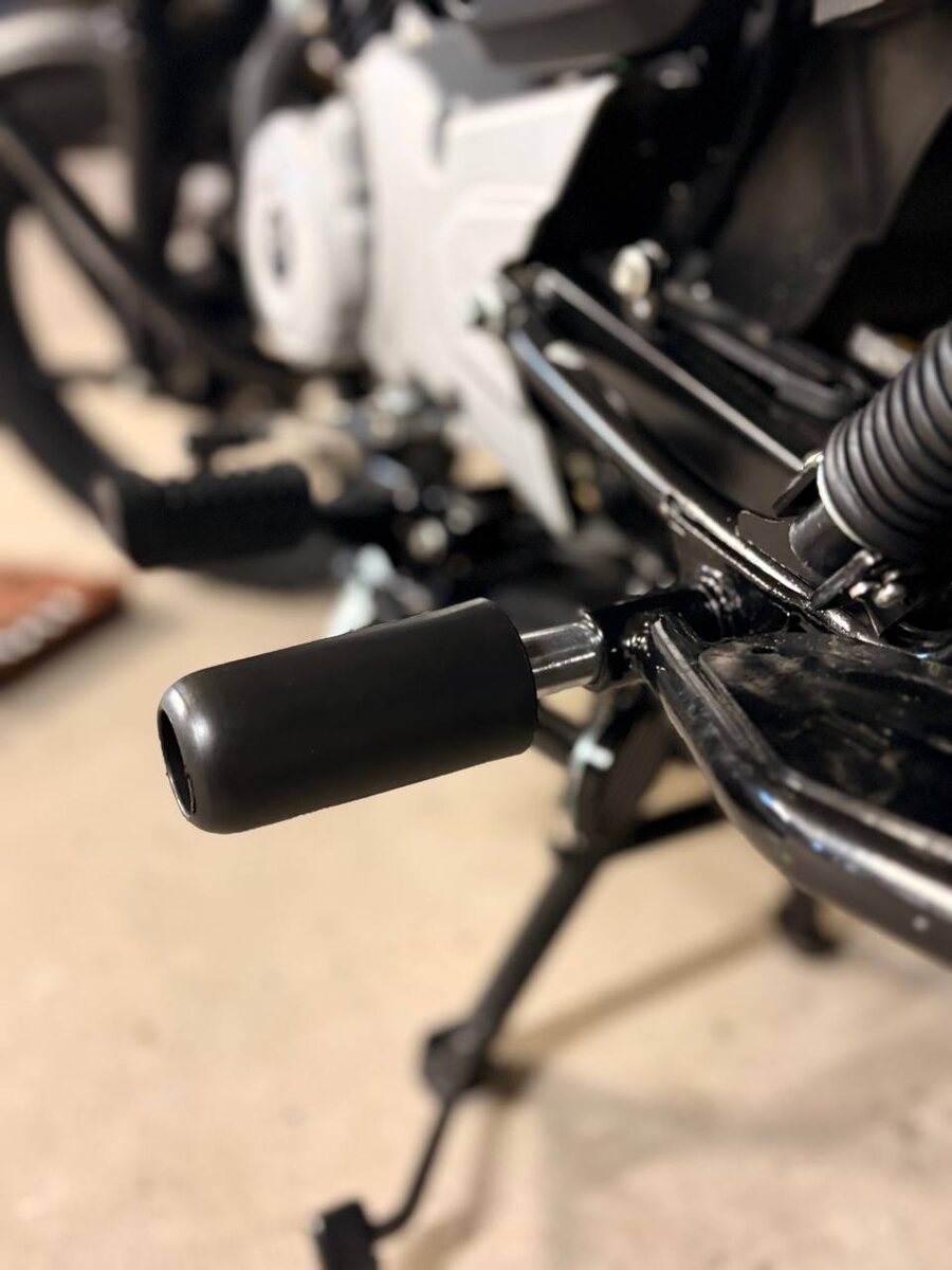 Установил боковые слайдеры в штатные места. Выпирают не сильно. Но и при завале мотоцикла примут на себя урон. Смотрятся как штатные детали. Боковые слайдеры на мотоцикле устанавливают для защиты хрупких деталей от разрушения при падении. При падении мотоцикл продолжает двигаться вперёд по инерции, и велика вероятность разрушения боковых пластиковых щитков и протирания крышки двигателя. Слайдеры не позволяют деталям разрушиться, тем самым уменьшая величину урона. Также слайдеры могут устанавливаться на маятник заднего колеса, на ручки руля и даже на выхлопные трубы.