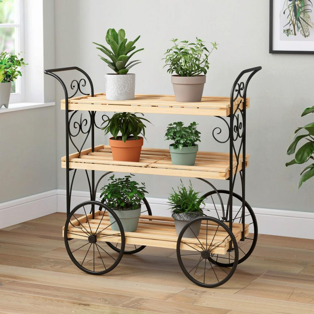 Размеры будущей тележки – вопрос сугубо индивидуальный. Кто-то захочет создать компактный вариант для нескольких горшков с пряными травами, а кто-то – крупный объект для пышных петуний и пеларгоний. Классическая конструкция предполагает наличие прямоугольной основы-платформы на четырех ножках, к которым крепятся колеса. Второй ярус, если он планируется, устанавливается на стойках, поднятых от основания.