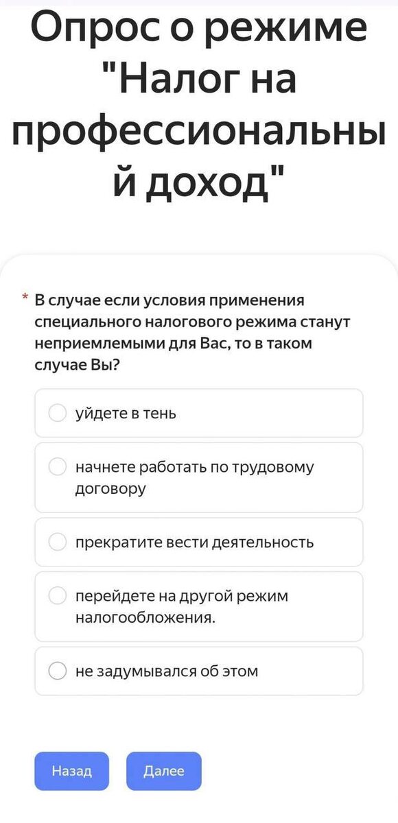 Так ФНС интересует, какой процент от полученных доходов должны составлять налоги, чтобы это было справедливо, по мнению самозанятых, и что они думают делать если условия применения специального налогового режима станут неприемлемыми.