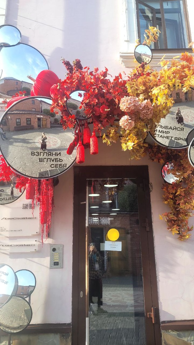 Гости на моих экскурсиях часто говорят, что в Казани установлено много фото-зеркал. Для эффектных селфи и просто для хорошего настроения. Где искать? В основном в центре города, но есть пару мест с особенно эффектными отражениями. Вообще, есть такой проект "Зеркала Татарстана". Так называются в официальной документации мои любимые Голубые озёра. Но сейчас не о них, а о настоящих зеркалах во весь рост, которые можно найти в разных локациях Казани. Место №1 - это Старо-Татарская слобода в районе улицы Каюма Насыри. Гуляя по ней, смело заглядывайте в разные дворы и закоулки, потому что большинство уютных фотозон запрятаны именно там. Смотрите сами Что классно, оформление зеркал меняют в зависимости от времени года. Тут соответственно осенняя тематика. Там же рядом эффектный автомобиль, набитый тыквами и осенним декором. Не совсем зеркало, но хорош. Гости города обожают рядом с ним фотографироваться. Поворачиваем и буквально в метре от нас Обратите внимание, что в оформлении зеркала ми